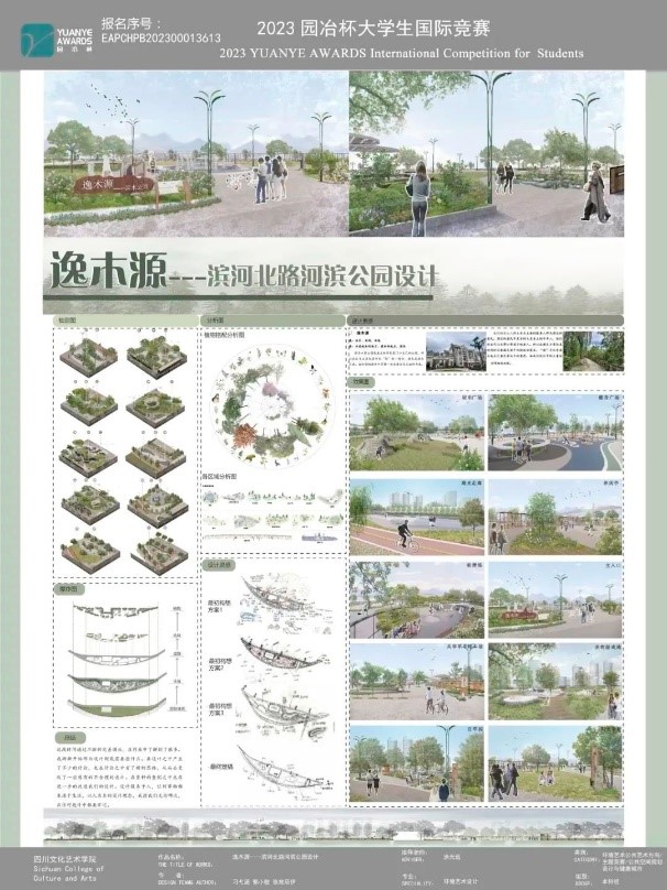 其中,我院获得第十四届园冶杯大学生国际竞赛优秀组织奖;我院涂光远老师指导,刁弋涵、郭小敏、张宛辰伊同学的作品《“逸木源”——滨河北路河滨公园设计》荣获第十四届园冶杯大学生国际竞赛健康城市与公共空间组别毕业设计荣誉奖;我院甘钰萍老师指导,李仁江同学的作品《“愿从心向,得之所颖”——交互性湿地公园景观设计》荣获第十四届园冶杯大学生国际竞赛公共艺术组别毕业设计荣誉奖;我院甘钰萍老师指导,杨策、张诚同学的作品《曲水为线,河城共融——生态可持续的城市景观设计》荣获第十四届园冶杯大学生国际竞赛课程设计城乡规划类荣誉奖;我院叶敏老师获得第十四届园冶杯大学生国际竞赛优秀联络员称号。