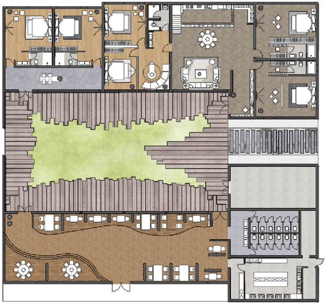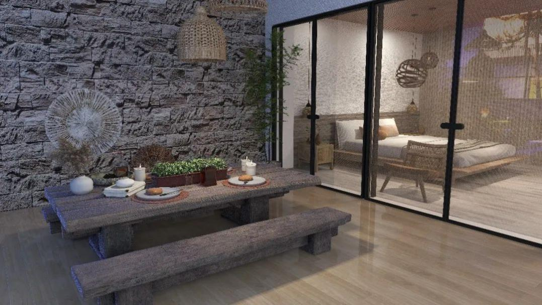 本次设计分庭院和室内两部分。庭院部分主要打造一个传承传统手工艺的庭院景观,采用石磨、染布两个传统手工艺运用到设计中,室内部分主要是用铁炉村本土特有的传统手工艺、农耕生产用具和当地的夯土文化特色为室内设计的主要来源。二者都设有体验区以及休闲区,通过室内的石磨体验区和庭院的景观小品、石磨体验区联系,同时室内的展览区和软装陈设与室外的染坊体验区联系,让本次设计更贴合老家、老院、老手艺,采用的材料也是贴合这一要点,加上体验区,让人们亲身去感受一下老手艺带来的乐趣。