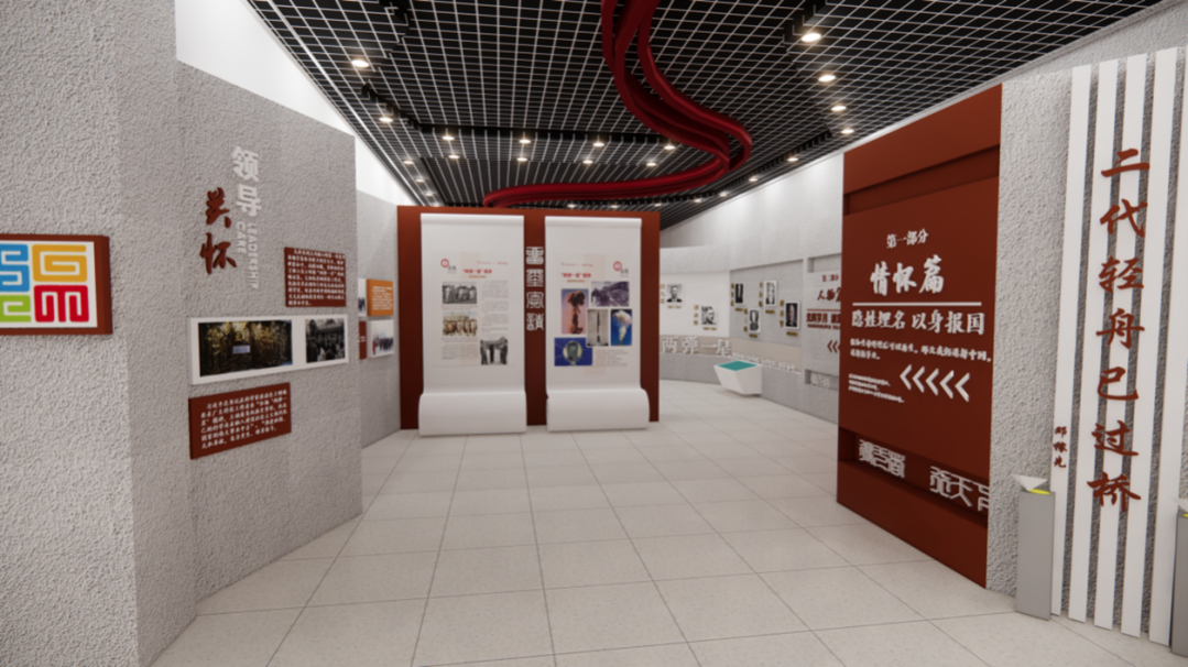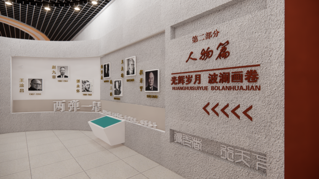 本次设计展厅分为四个区域,分别以不同的时间线来区分,由情怀篇、人物篇、现代篇、新媒体空间。以“热爱祖国,无私奉献,自力更生,艰苦奋斗,大力协同,勇于登攀”的“两弹一星”精神为主题。
