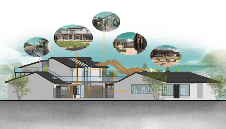 本设计为铁炉村乡土建筑改造设计,以“从回忆到回归”为主题,遵循传承创新和新旧共生的设计原则。以山、竹、瓦为元素运用到建筑的立面装饰,建筑材料上将乡土材料与现代建筑材料结合,打造出古朴典雅和现代简约的乡土建筑。