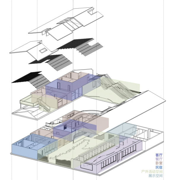 考虑到部分造型施工难的问题,结合现场情况和施工状态,在老旧穿斗结构上建出新的钢结构,就更具有实际意义。钢结构的增加保证了安全问题,穿斗结构的保留又体现了对老建筑文化的尊重,同时减少改造成本。针对这样的设计我们认为这样更容易让当地人接受。乡村建筑面临的问题很大一部分是因为过于学习城市建筑,对自己的文化的不认同,我们希望能给未来使用的人群传达一种乡土建筑的美,同时使用传统老旧建筑的改造又更符合实际。希望这种改变能让更多一部分人认同这类建筑文化。