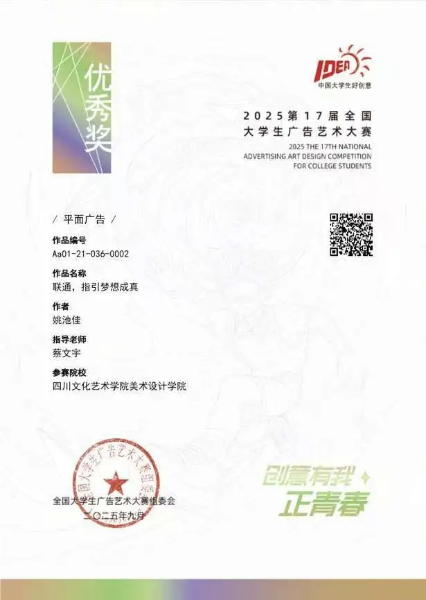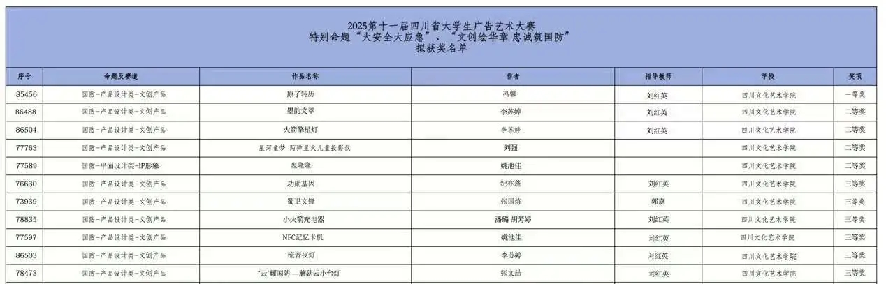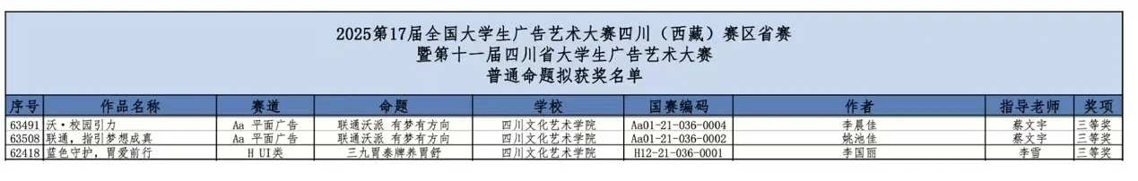 近日,第11届四川省大学生广告艺术大赛及第17届全国大学生广告艺术大赛评选结果相继揭晓。我院产品设计专业学子表现优异,在第11届四川省大广赛普通命题赛道中,荣获省级三等奖3项,其中2组作品成功晋级第17届全国大广赛全国总评审,并最终斩获国赛优秀奖,展现出扎实的专业能力和出色的创新水平!在第11届四川省大广赛特殊命题赛道中,荣获一等奖1项、二等奖4项、三等奖6项的丰硕成果!全国大学生广告艺术大赛(大广赛)是面向全国在校大学生的一项广告策划创意实践活动。目的在于活跃大学生的课外文化生活,激发大学生的创意灵感,加强大学生实践能力、创新能力和合作精神的培养,推动大学新闻传播、广告艺术教育的人才培养模式和实践教学的改革,为优秀人才脱颖而出创造良好的竞赛平台,不断提高人才培养质量。大广赛是迄今为止全国规模大、覆盖高等院校广、参与师生人数多、作品水准高、受高校教师欢迎、有较大社会影响力的全国性高校学科竞赛。近年来,产品设计专业积极践行“以赛促学、以赛促教”的教学理念,鼓励学生参与高水平专业竞赛,将课堂所学与实战项目深度融合。此次获奖既是对同学们专业能力的充分肯定,也是我院持续深化教学改革、注重创新人才培养的重要体现。