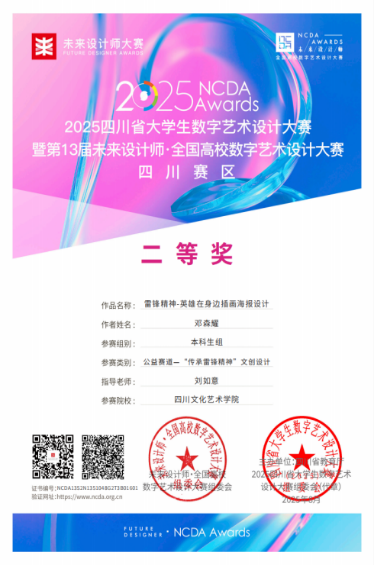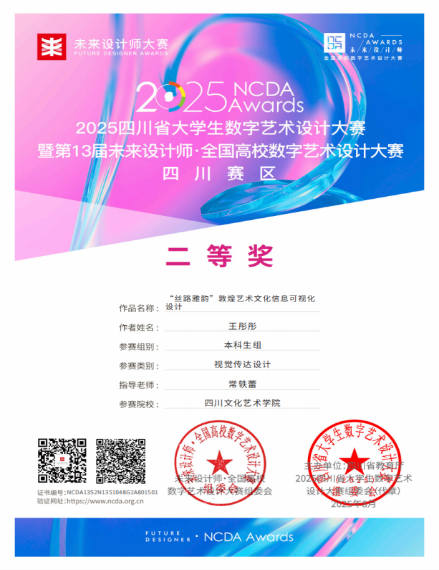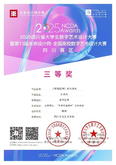 大赛共有1893所高校参赛,共征集29万余件作品,设立29个省级赛区,设计学学科评估C以上高校100%参赛。在本届大赛中,通过“校级赛-资格赛-省级初赛-省级决赛-全国总决赛”的层层选拔,美术设计学院积极组织参赛,2023级视觉传达设计专业本科3班学生王彤彤获得了2025第13届未来设计师·全国高校数字艺术设计大赛全国总决赛三等奖;专业共斩获2025第13届未来设计师·全国高校数字艺术设计大赛四川赛区二等奖5项,三等奖3项。常轶蕾老师、韩美仪老师、刘如意老师、马龙跃老师获得优秀指导教师奖。