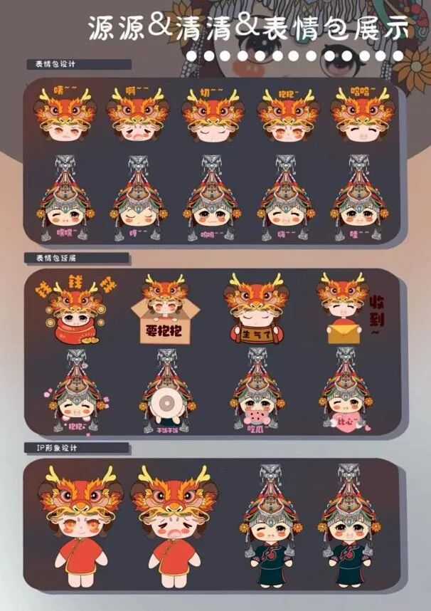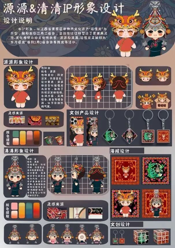 设计说明:IP形象设计以江西省青原区非物质文化遗产“箍俚龙”为核心灵感,结合东固“二月二”庙会民俗与畲族传统纹样,塑造出一对Q版文化传承使者——“源源”与“清清”。以红黄色调呈现,融合箍俚龙“东方巨龙”的意象,以活泼的龙头造型展现庙会的喜庆与活力;清清则身着畲族传统黑色民族服饰,饰以精致纹样,传递畲族文化的庄重与韵味。