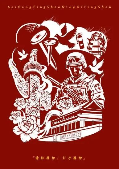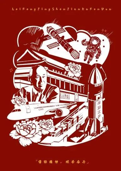 设计说明:该三张插画分别从不同角度诠释了雷锋精神的内涵:无私奉献精神、钉子精神以及艰苦奋斗精神。乡村教师张桂梅、医护人员呈现了雷锋精神无私奉献方面;军人、消防员形象展现了雷锋精神的钉子精神,即坚韧不拔、持之以恒;科研人员、长征五号、宇航员、人造卫星体现了在科研领域的艰苦奋斗精神。整体设计主旨在传达雷锋精神在各领域的广泛传播。