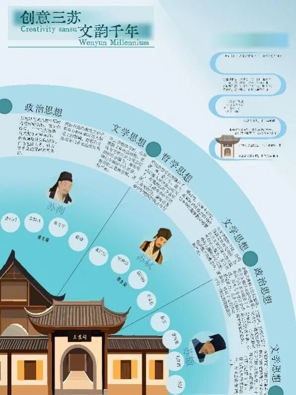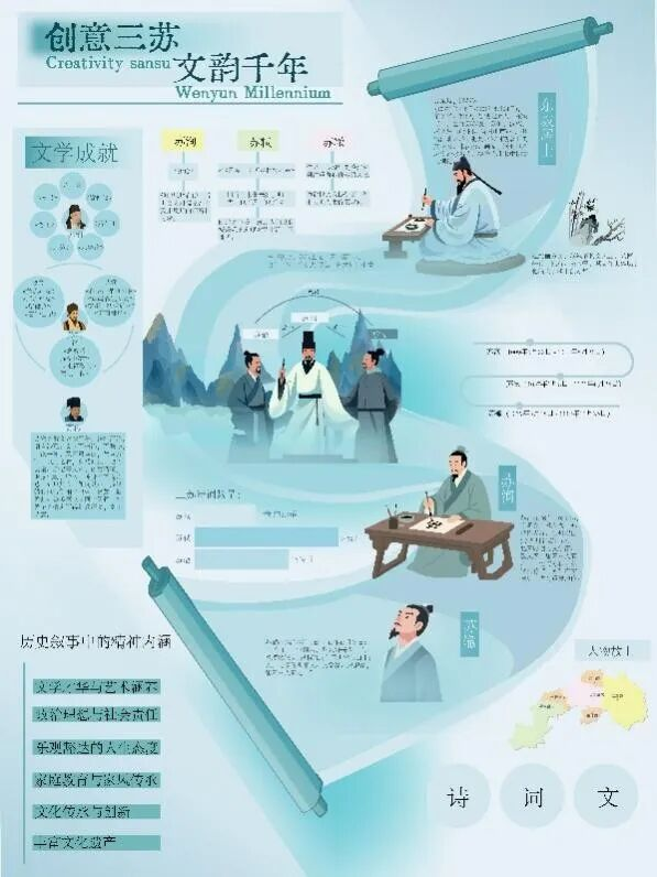 设计说明:设计采用书卷作为视觉骨架,象征苏门家学源远流长、彼此交融又各自精彩。三人肖像插画辅以生卒年、字号,文学成就等最关键文字信息。现代简约的数据图表与中国传统元素水墨、书卷相结合,既传统又现代。