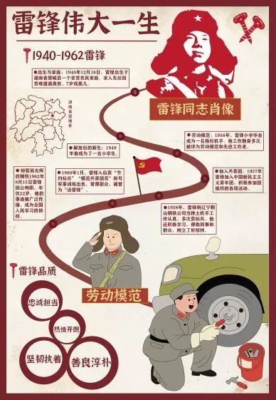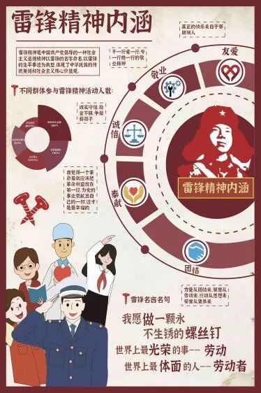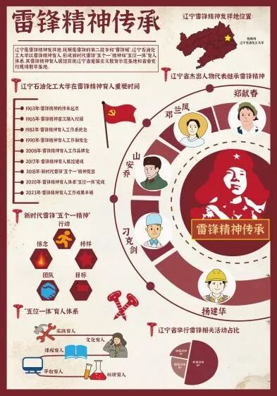 设计说明:这三张海报以时间轴、地图和插画形式系统展现雷锋精神。第一张通过雷锋生平关键节点展示其成长历程与事迹;第二张聚焦辽宁石油化工大学育人历程和新时代“五个一精神”,呈现精神传承的延续性与时代创新;第三张围绕“友爱、敬业”等核心,用图标、名言和群体参与数据阐释精神要义,体现精神在当代多元群体中的践行。三张海报风格统一、内容分层,引导观者认识、理解并传承雷锋精神。