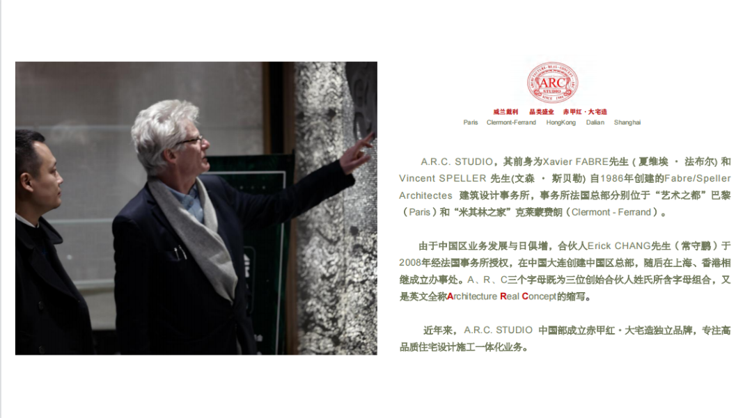 A.R.C. STUDIO,其前身为Xavier FABRE先生 ( 夏维埃 · 法布尔) 和Vincent SPELLER 先生(文森 ·斯贝勒) 自1986年创建的Fabre/SpellerArchitectes 建筑设计事务所,事务所法国总部分别位于“艺术之都”巴黎(Paris)和“米其林之家”克莱蒙费朗(Clermont - Ferrand)。
