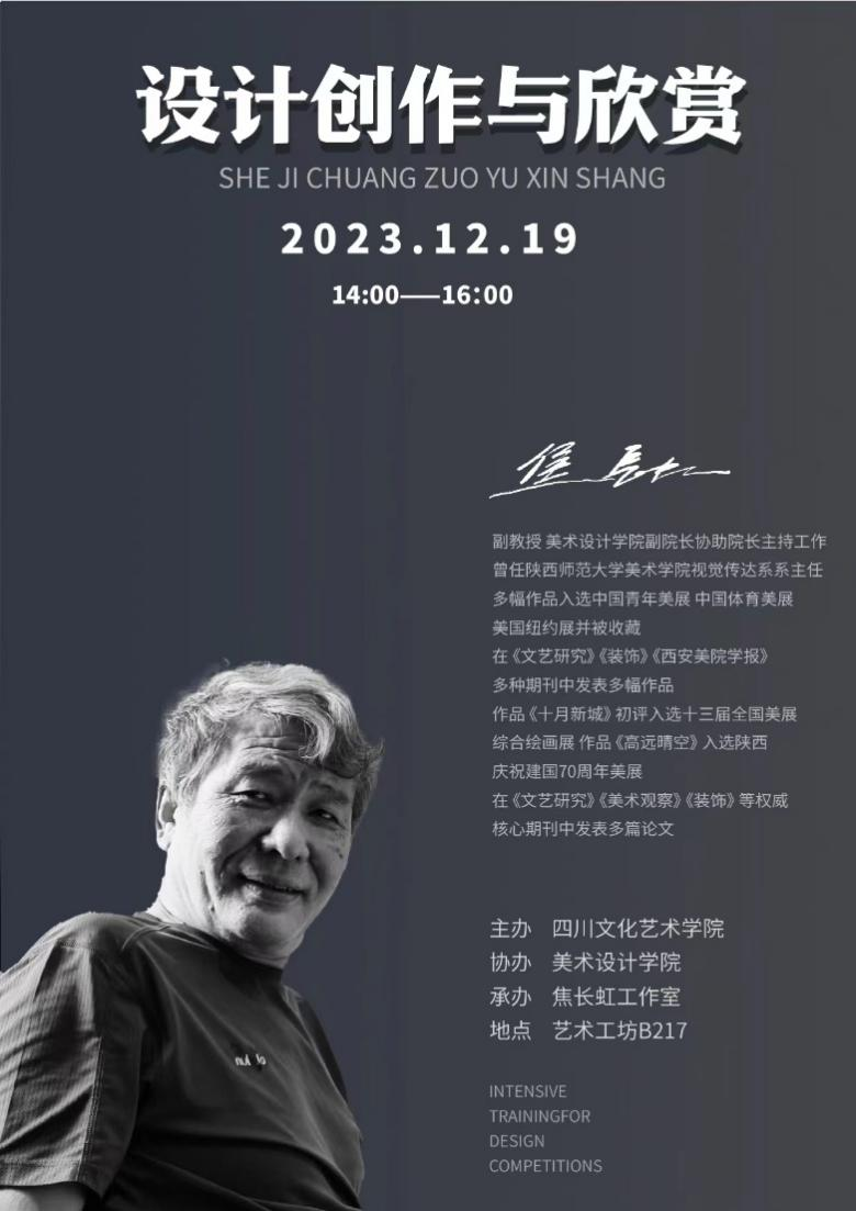 2023年12月19日下午,美术设计学院副院长焦长虹在艺术工坊B-217开展了以“设计创作与欣赏”为主题的专题讲座,并与学院师生就设计创作与欣赏相关理论知识和实践案例等方面进行了深入交流。