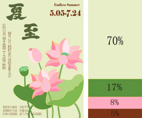 在海报设计过程中,需遵循色彩运用的三七原则。每位学生要根据自身偏好,选择具象或抽象的图形来开展设计。本次设计主题为“春夏秋冬”,需完成四张海报。在这四张海报里,要明确体现出色彩三七原则中不同颜色的占比情况,同时,每张海报都要精准传达出相应的情绪,并清晰表达出与“春夏秋冬”各季节对应的主题内涵。
