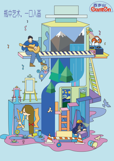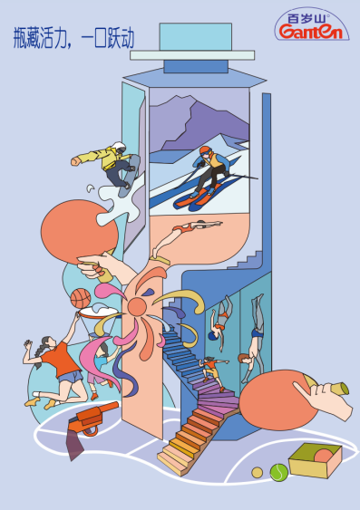 设计说明:以百岁山 “自然甘冽” 为基底,瓶身作文化容器串联艺术等维度,绑定生活场景,传自然人文品牌价值。