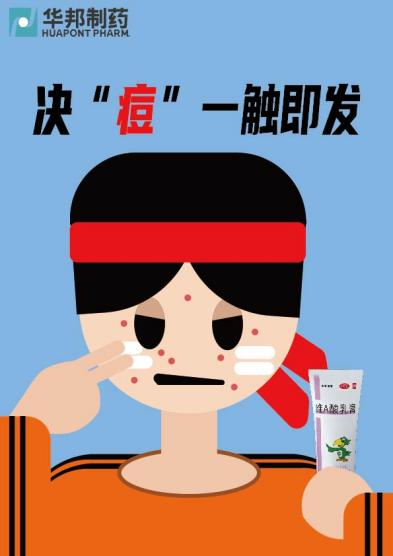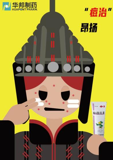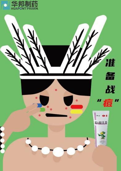 设计说明:用原始 - 古代 - 现代人物元素,以药膏 “宣战” 痘痘,隐喻华邦长期深耕脸部护理的态度与对消费者的责任心。
