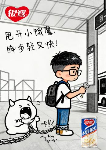设计说明:聚焦学生饥饿场景,“小饿魔” 具象困扰,银鹭为 “解饿之光”,传即时补能、贴心陪伴的产品价值。