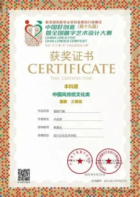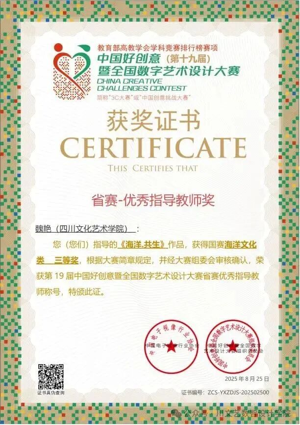 此次赛事成绩的取得,既是学生专业能力的集中体现,更是学院视觉传达设计一流专业建设与“以赛促学、以赛促教、课赛融合”教学模式落地见效的有力证明。通过赛事实践,学生设计能力与软件应用水平显著提升,数字艺术设计教育理论与实践深度融合,进一步凸显了学院在视觉传达设计专业人才培养方面的扎实成效。