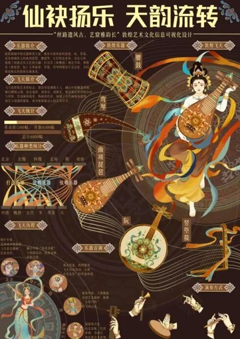 设计说明:本次信息可视化设计以“丝路雅韵”为核心,深度聚焦敦煌建筑的雄浑古朴、四神兽的神秘意象、壁画佛像的庄严瑰丽、传统乐器的千年余韵、飞天图的灵动飘逸及特色纹样的精妙绝伦。秉持文化传承与视觉创新融合的理念,采用模块化叙事拆解文化脉络,以色彩符号强化敦煌文化标识,打造沉浸式的敦煌文化视觉体验,让千年丝路文明焕发全新魅力。