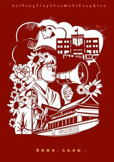 设计说明:该三张插画分别从不同角度诠释了雷锋精神的内涵:无私奉献精神、钉子精神以及艰苦奋斗精神。乡村教师张桂梅、医护人员呈现了雷锋精神无私奉献方面;军人、消防员形象展现了雷锋精神的钉子精神,即坚韧不拔、持之以恒;科研人员、长征五号、宇航员、人造卫星体现了在科研领域的艰苦奋斗精神。整体设计主旨在传达雷锋精神在各领域的广泛传播。
