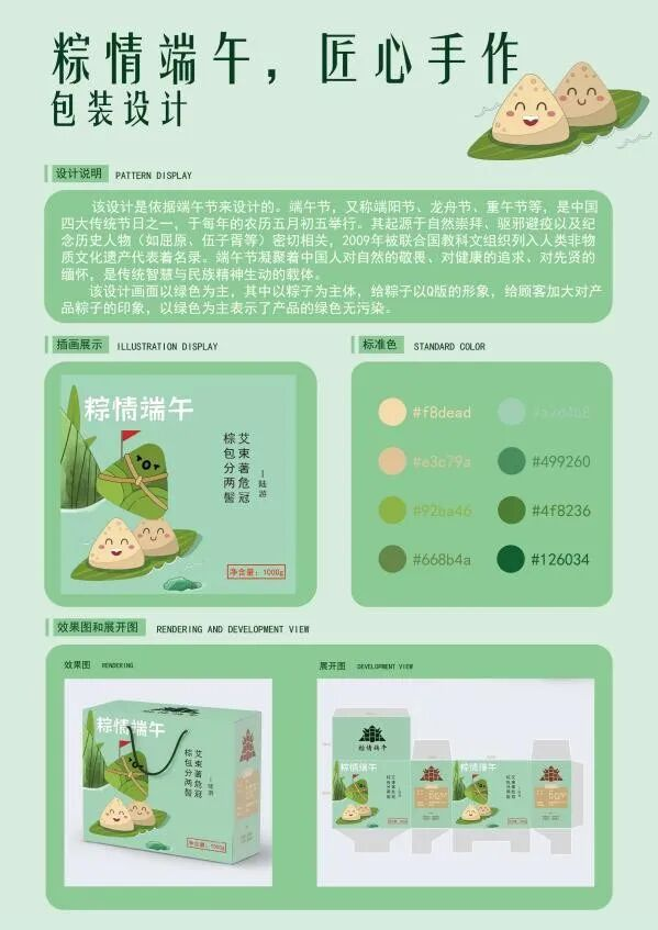 设计说明:设计灵感源自端午节。该节日又称龙舟节、端阳节,是中国重要的传统文化遗产(2009年被列入人类非物质文化遗产代表名录)。本次设计旨在通过视觉语言,展现其自然崇拜、驱邪避疫与纪念先贤的多重起源,以及赛龙舟、食粽等节俗特色。