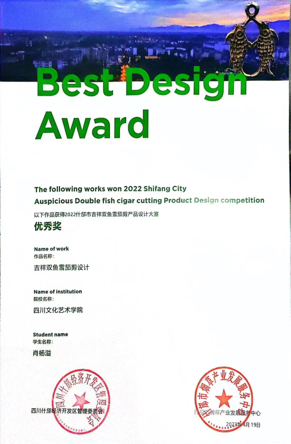 肖杨溢同学2022什邡市吉祥双鱼雪茄剪产品设计大赛中获优秀奖
